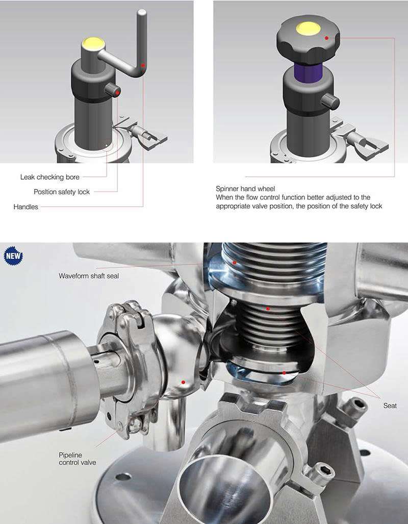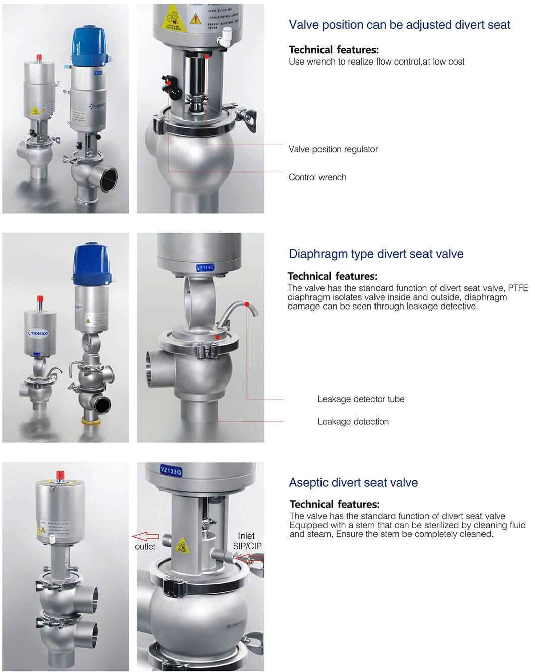Van chuyển hướng vi sinh (Sanitary Divert Valve) được thiết kế sáng tạo với cấu trúc một seat hoặc hai seat, cho phép hệ thống đường ống vận hành linh hoạt, tối đa có thể chuyển hướng tới 5 ngả. Van có thể vận hành tay hoặc tự động, mang lại độ an toàn cao, tính vi sinh vượt trội và tuổi thọ lâu dài. là loại van chuyên dụng, thường được chế tạo từ inox đánh bóng 316L, dùng để chuyển hướng dòng chảy của chất lỏng hoặc bột giữa hai hay nhiều đường ống trong các ngành thực phẩm, sữa và dược phẩm.