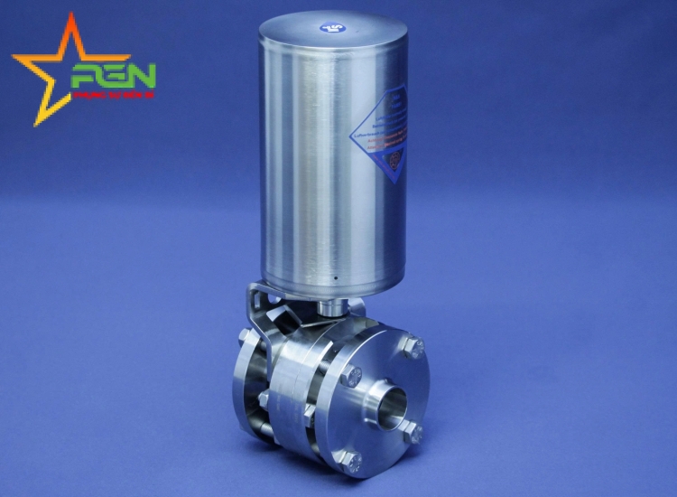 - Van bi khí nén kết nối mặt bích DN25, inox 316L, bề mặt trơn, bộ truyền động khí nén size 1, tác động khí mở – lò xo đóng (thường đóng), gioăng PTFE/FEP
